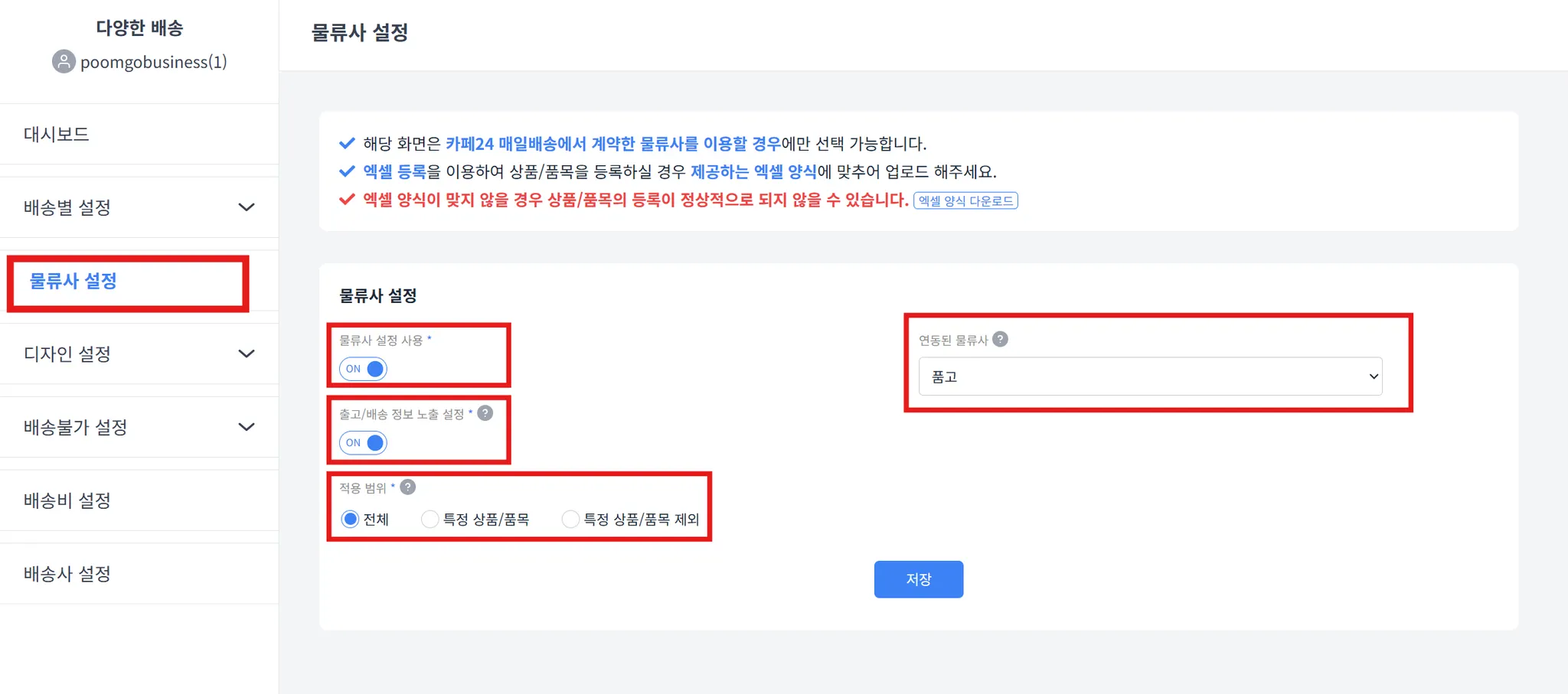물류사 설정 사용 :
