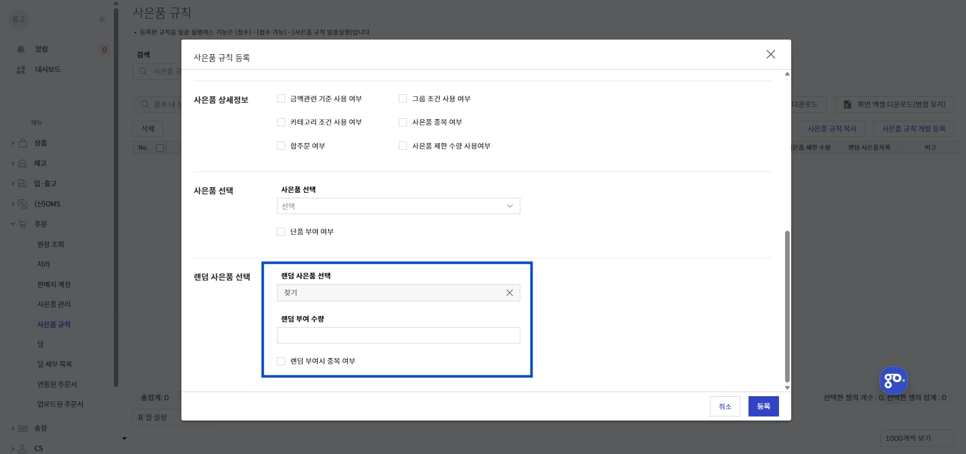| 랜덤 부여 수량: 사은품이 증정되어야 하는 수량 입력
