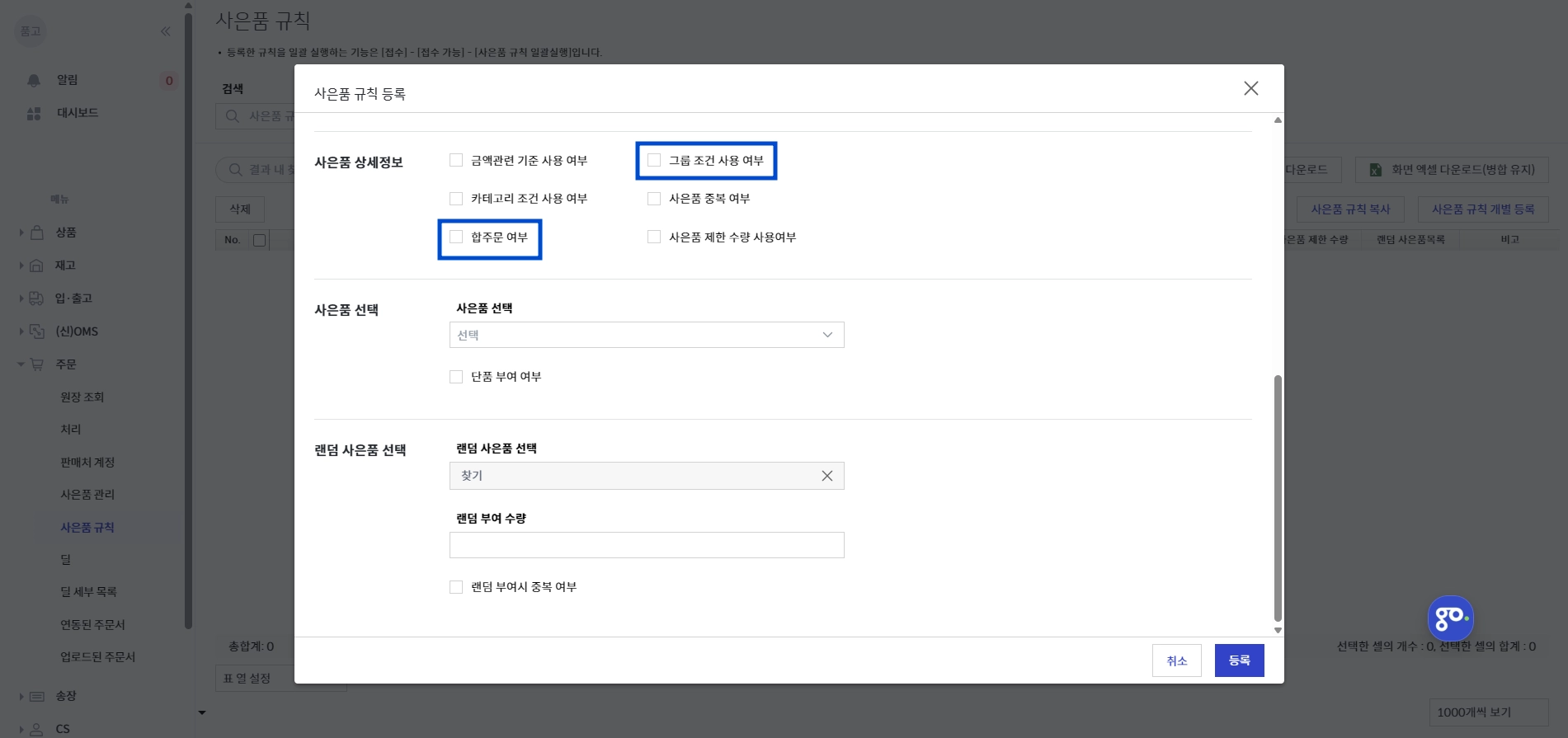 ‘사은품 선택’과 ‘랜덤 사은품 선택’은 동시 적용이 되지 않습니다.