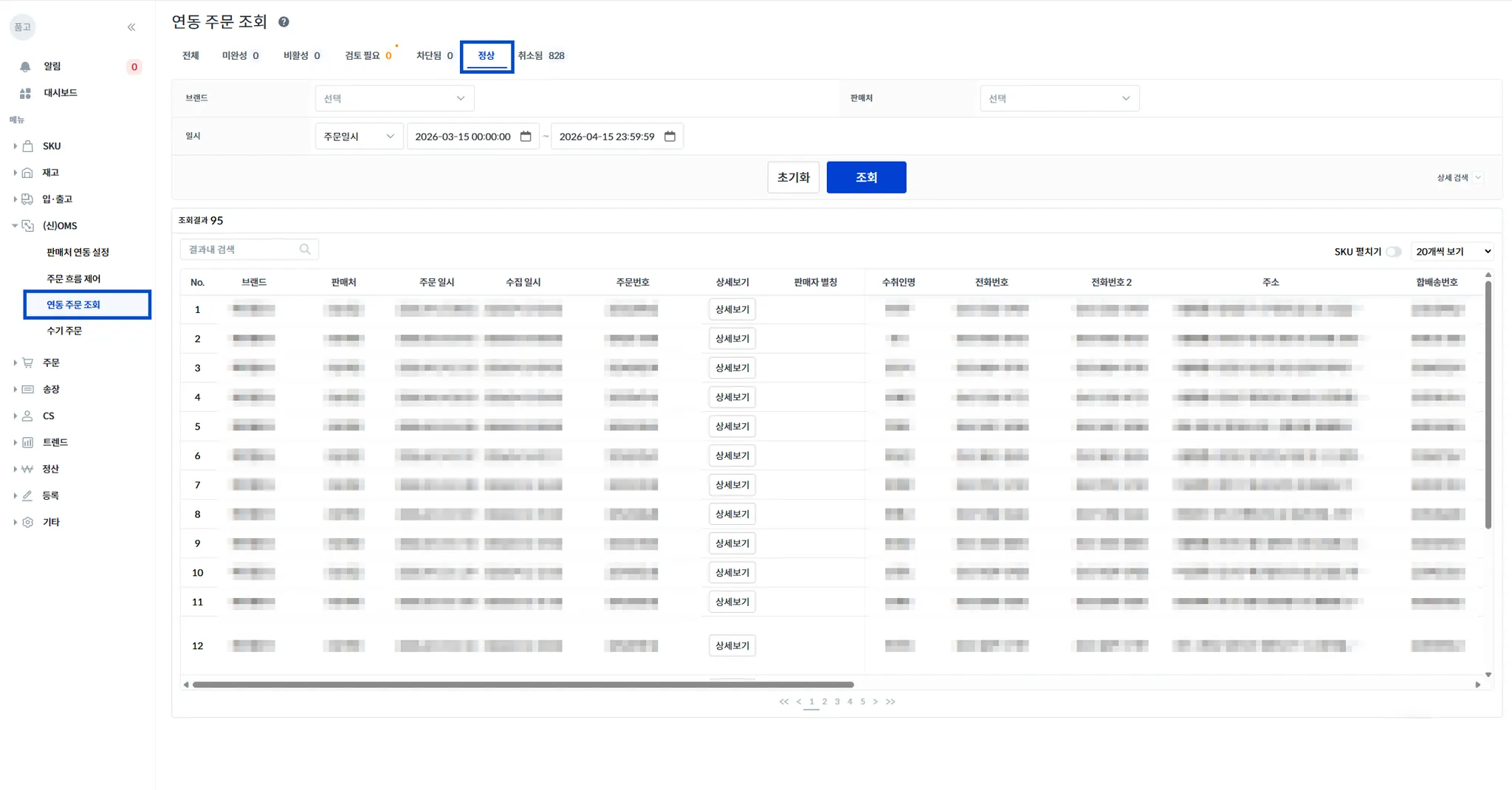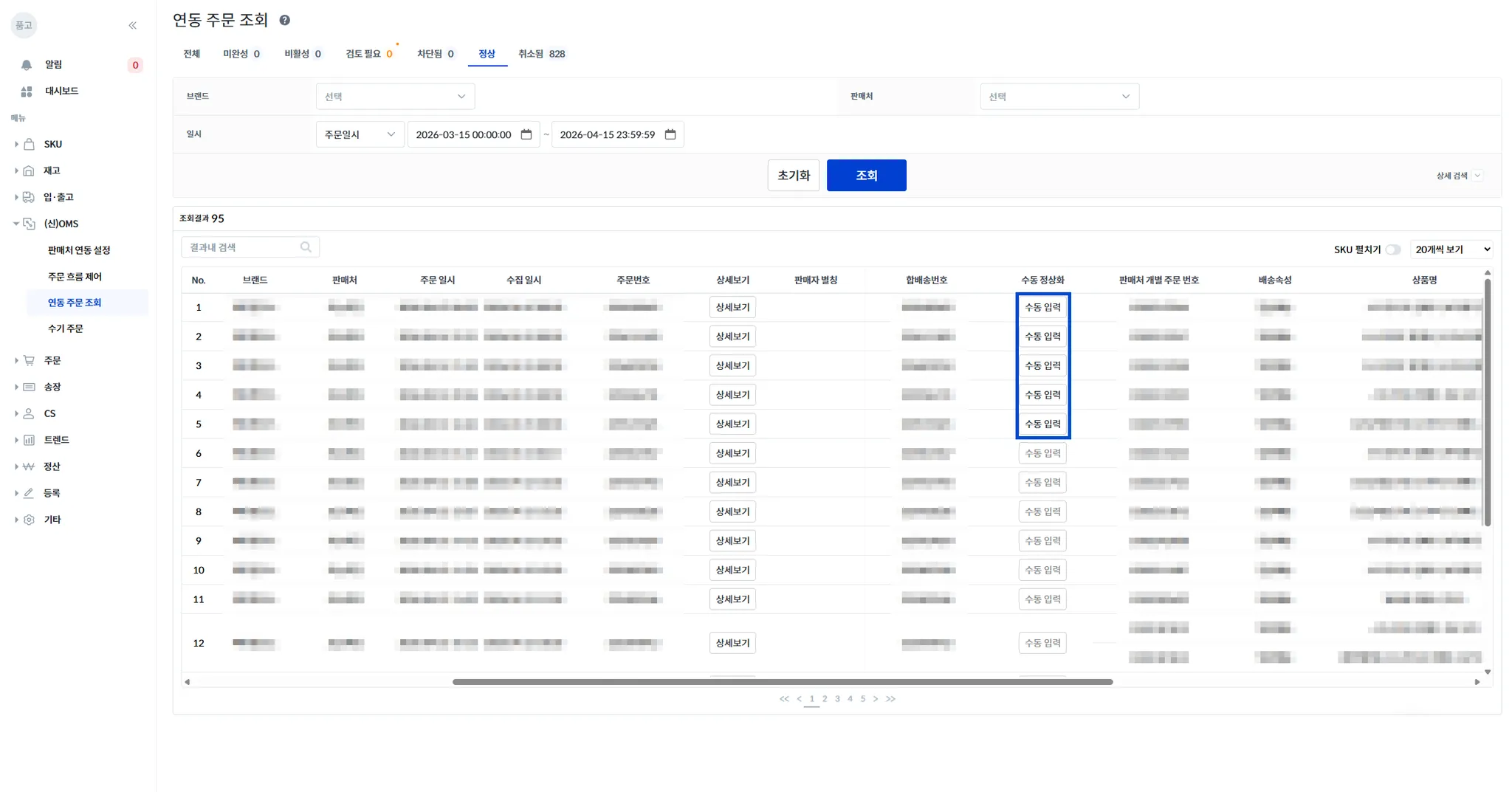 품고나우 좌측 [(신)OMS → 연동 주문 조회 → 정상]으로 접속해 주세요.