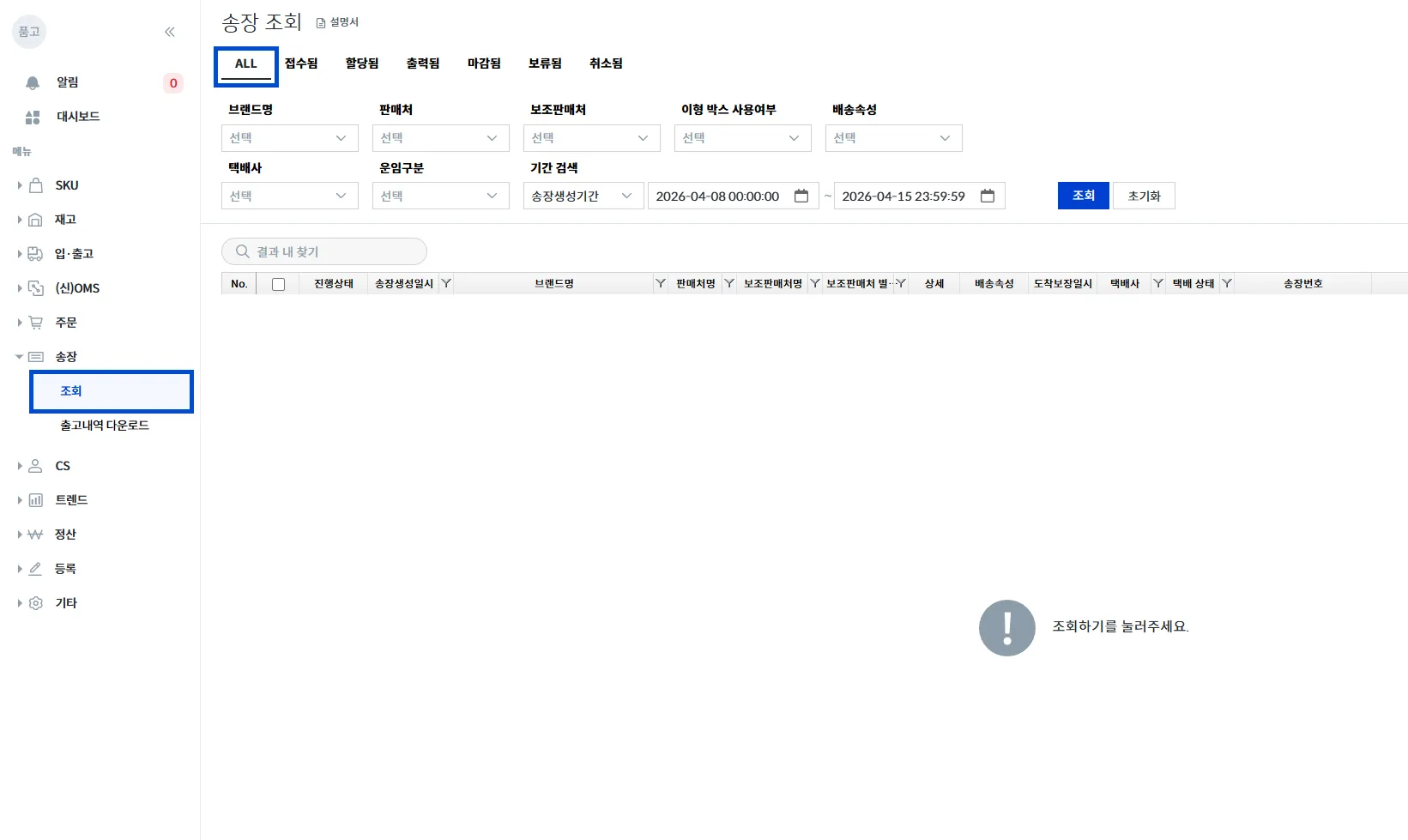 수기 주문 개별 등록이 완료된 이후 약 10분 뒤, [송장 → 조회]에서 주문 확인이 가능합니다.