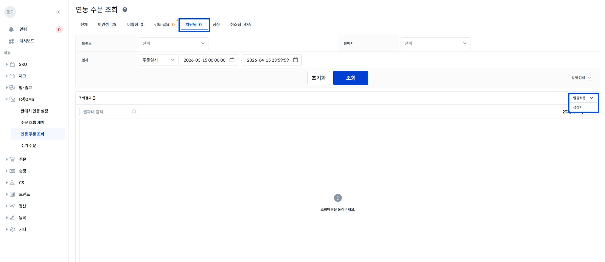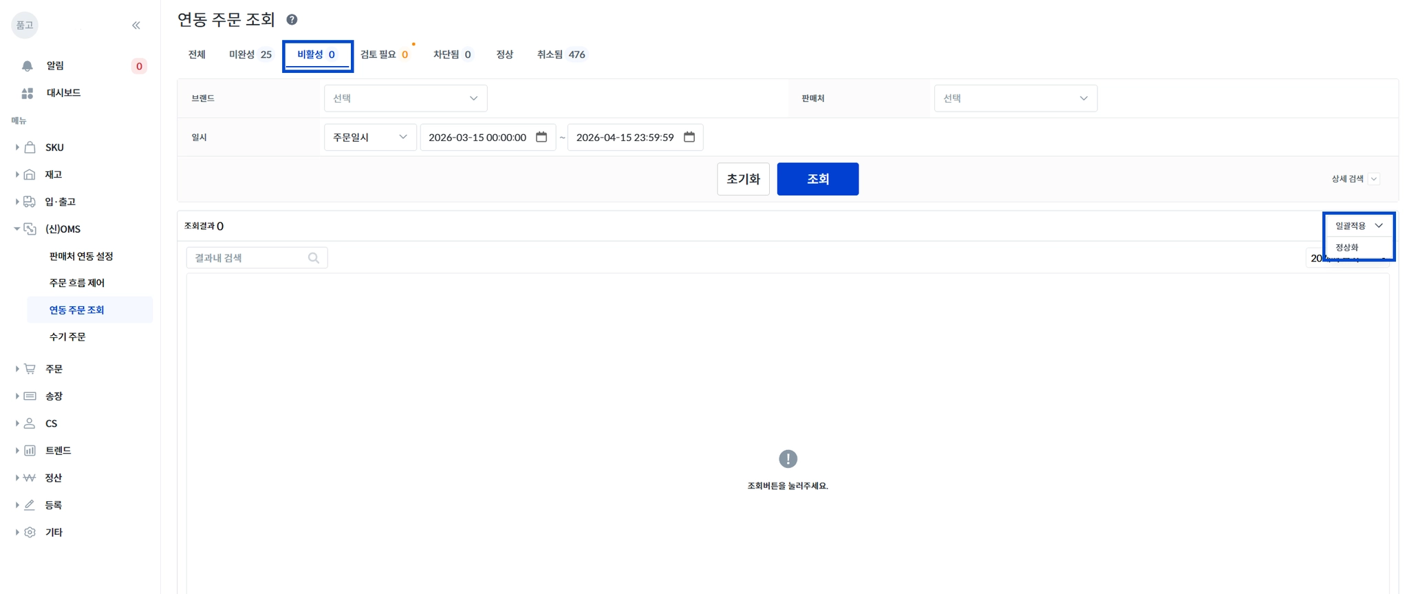 (신)OMS → 연동 주문 조회 → 비활성 탭