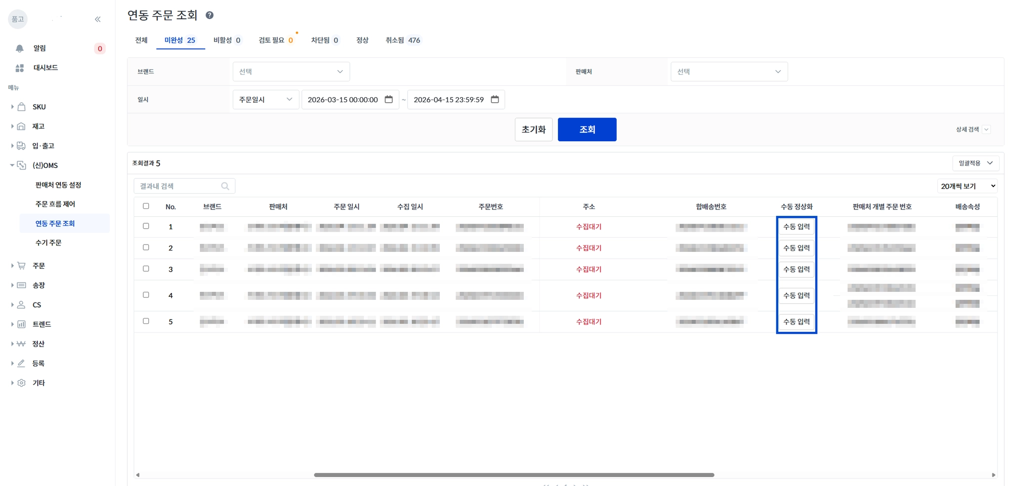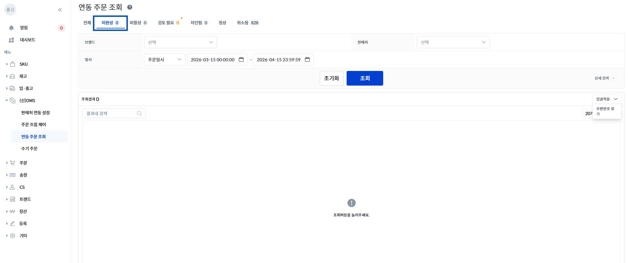 (신)OMS → 연동 주문 조회 → 미완성 탭