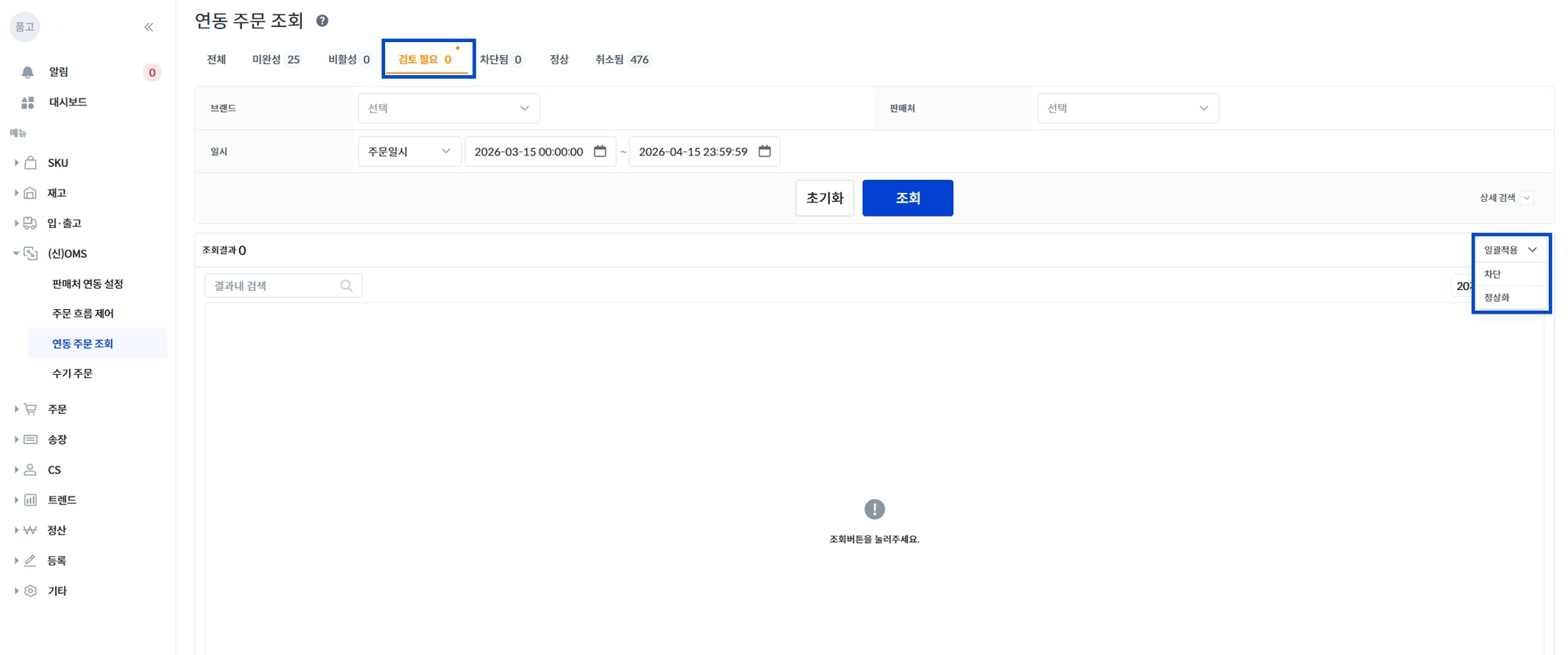 (신)OMS → 연동 주문 조회 → 검토필요 탭