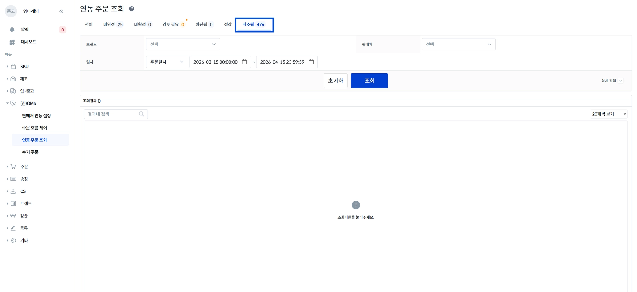 (신)OMS → 연동 주문 조회 → 취소됨 탭