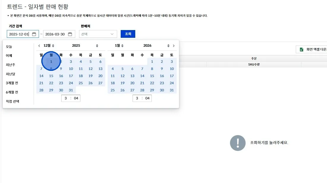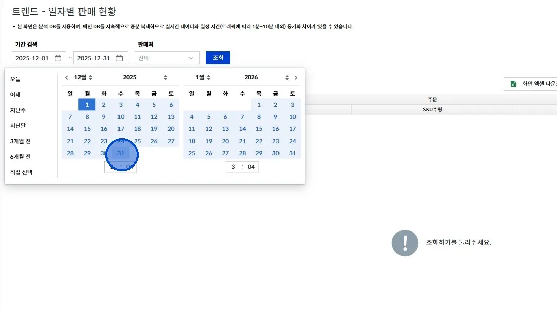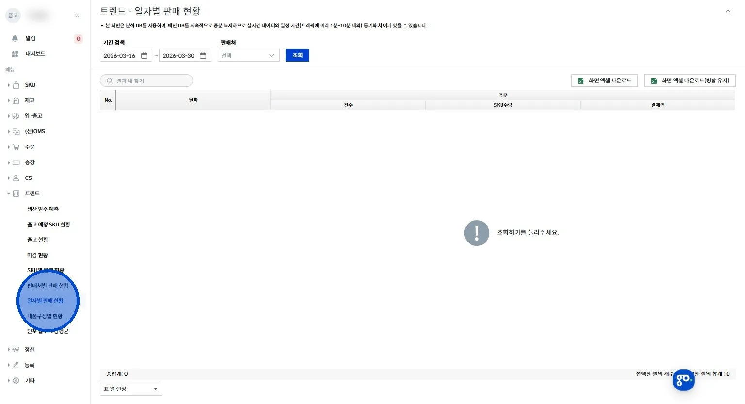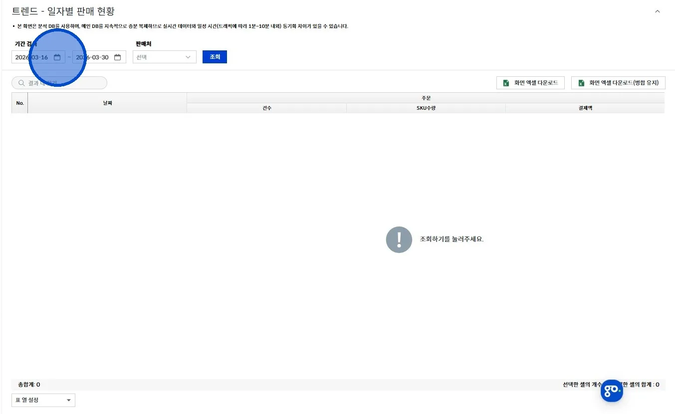 좌측 메뉴에서 [트렌드 → 일자별 판매 현황] 클릭해 주세요.