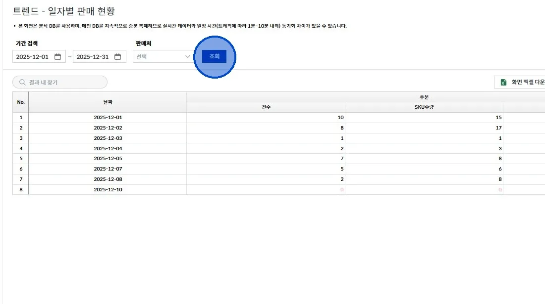 [조회] 누르면, 일자별 주문 건수와 SKU수량 확인할 수 있어요.