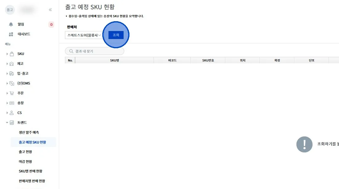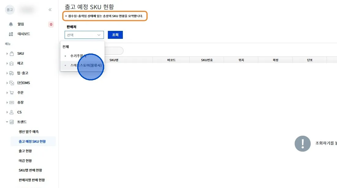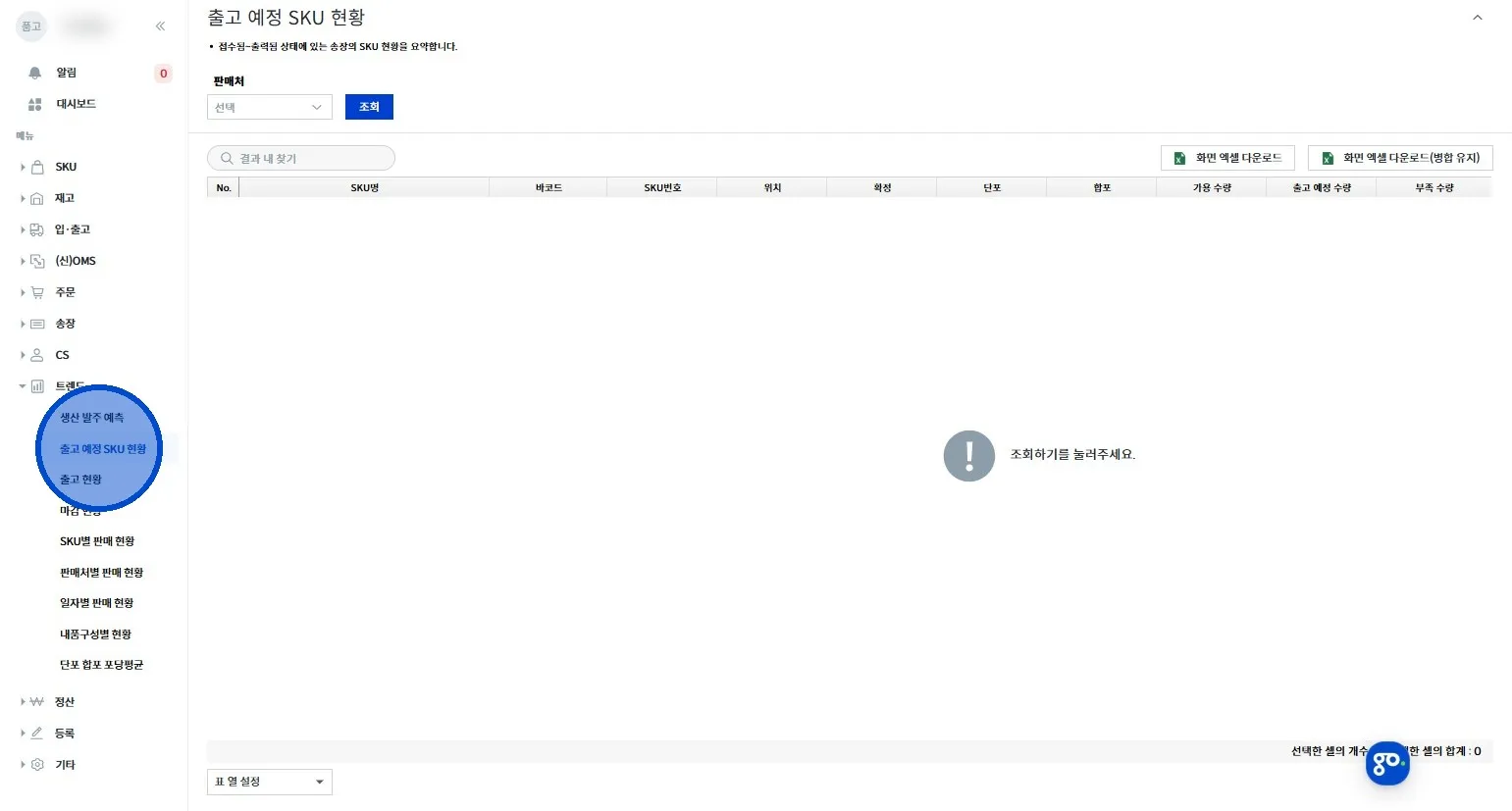 좌측 메뉴에서 [트렌드 → 출고 예정 SKU 현황] 클릭해 주세요.