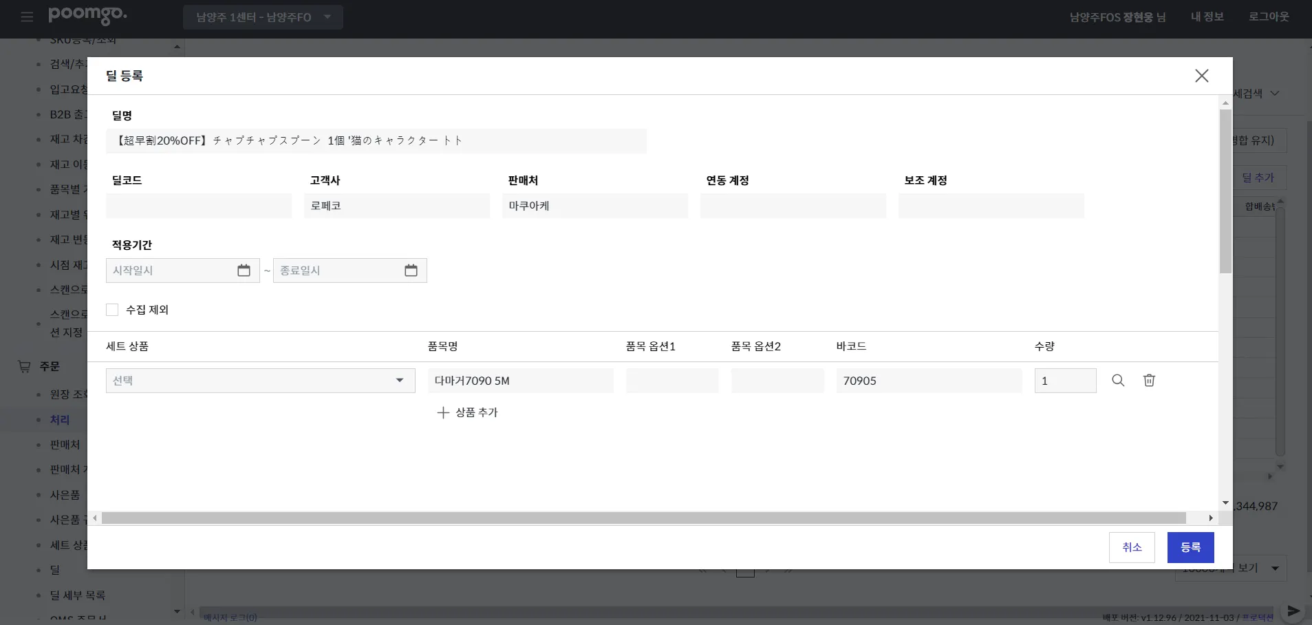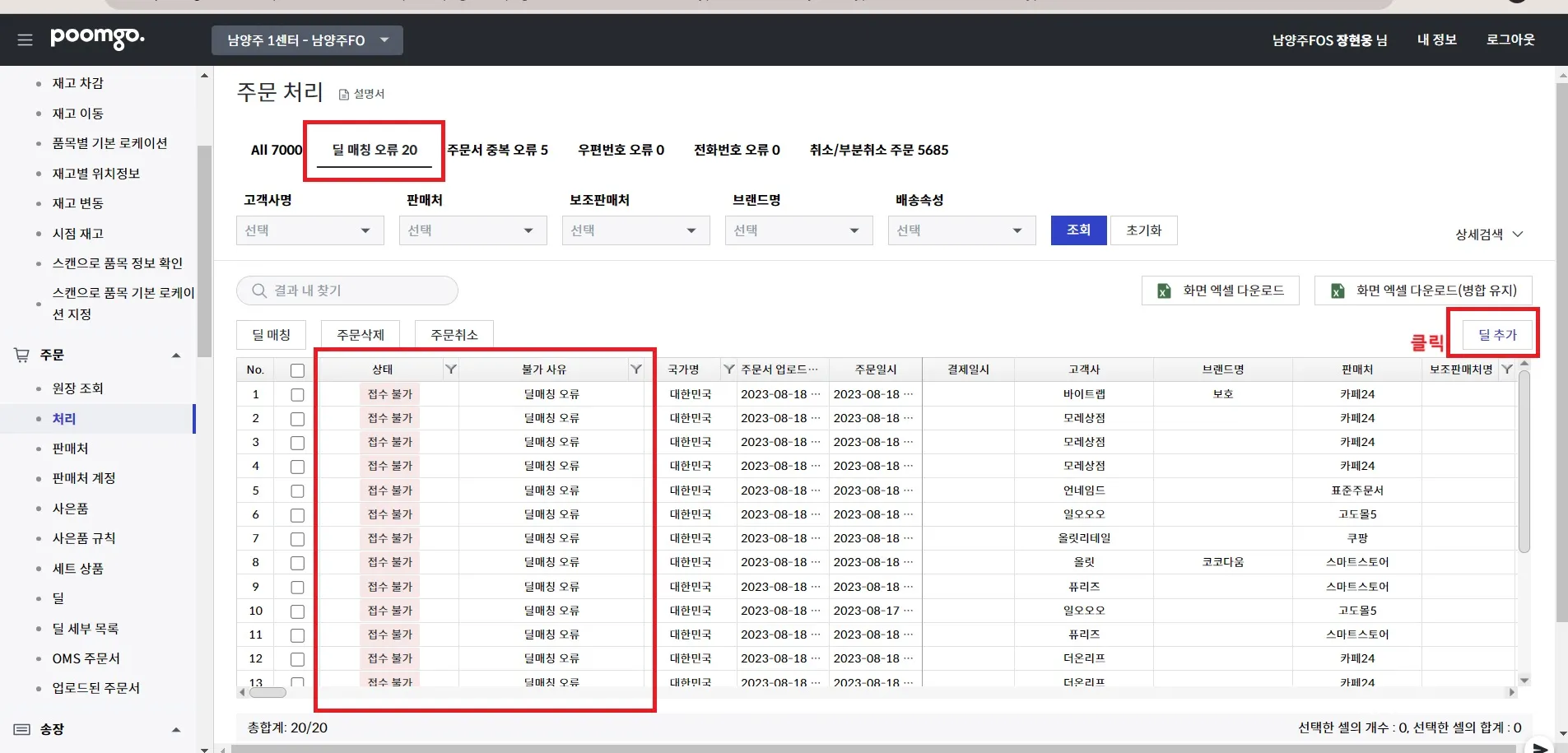주문 - 처리 - 딜 매칭 오류탭 “딜추가” 버튼 클릭