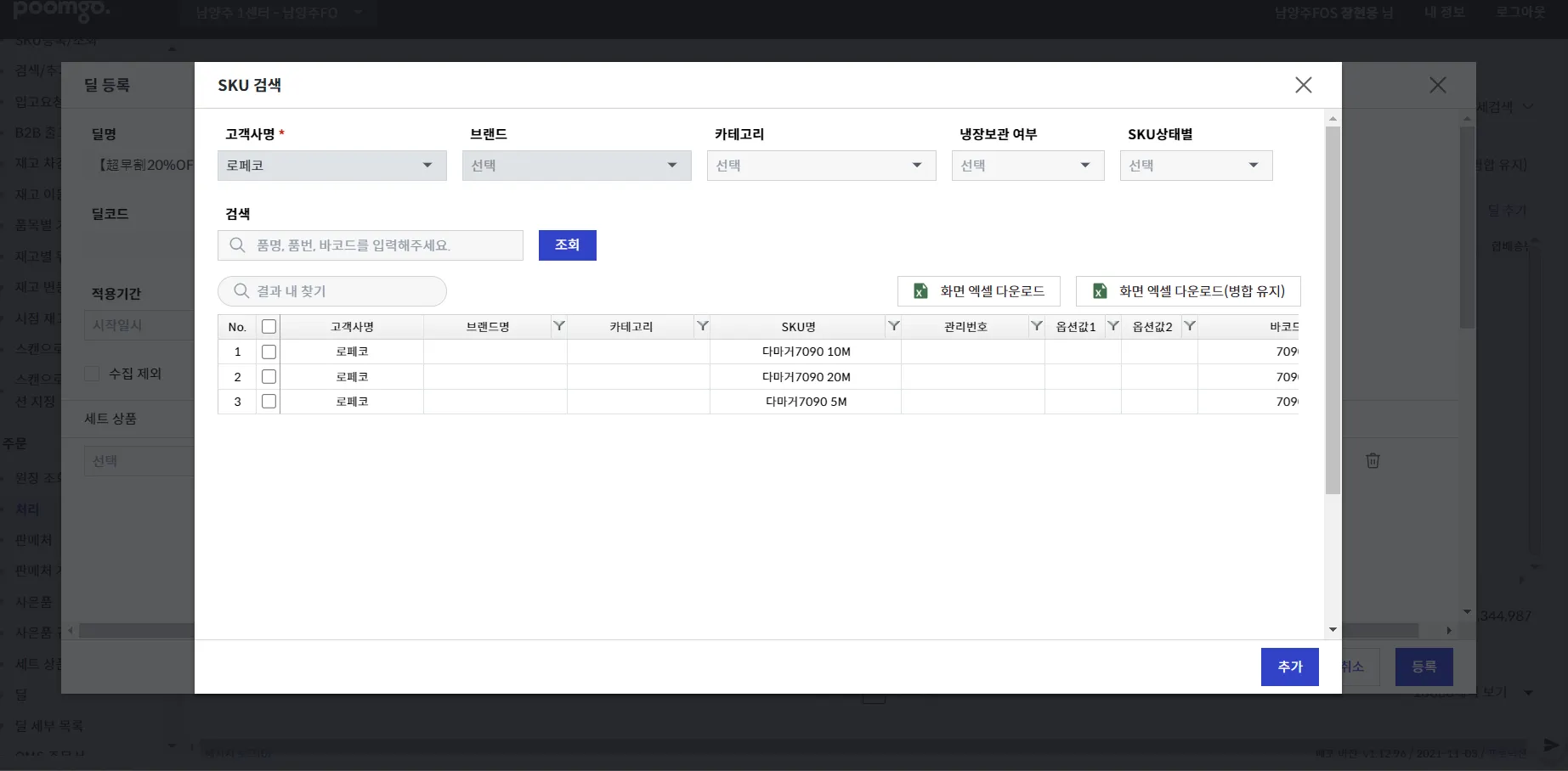 4. 돋보기 모양 클릭 후 위 상품 등록된 제품 중 딜명에 해당하는 제품 선택 후 추가 버튼 클릭