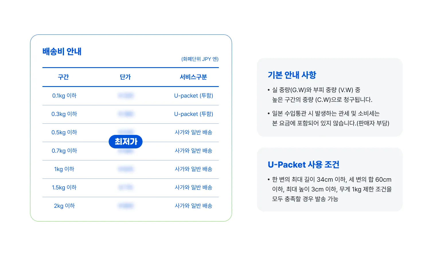 큐텐재팬 서비스는 배송비, 목록 변환 통관 비용, 국내 운송비가 모두 포함된 ALL-IN-RATE 요금으로 배송비가 저렴해요. 특히 일본 배송의 경우 현지 물류/택배비는 기본적으로 비싼 편이고, 통관비 또한 부담스러운 경우가 많은데요. U-Packet사용 조건을 충족하는 상품들을 취급하는 브랜드라면 통관비를 포함한 요금을 제안해 타 배송사보다 합리적인 가격에 이용할 수 있어요.