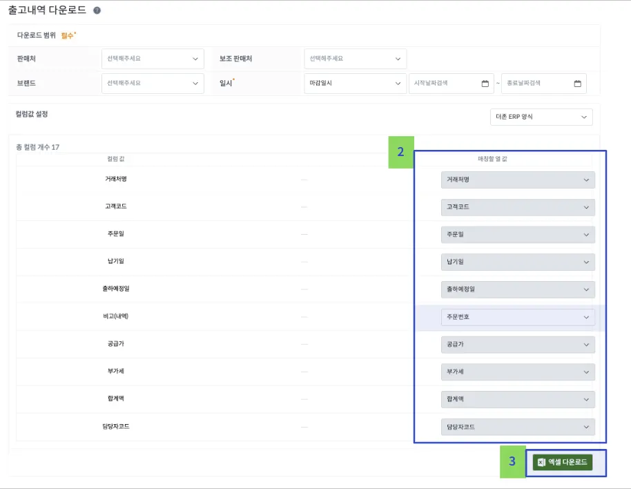 송장 - 출고내역 다운로드 탭이 새롭게 생성되었습니다. (23년 11월 3일) 해당 메뉴는 출고 내역 자료와 더존 ERP 양식 다운로드를 지원합니다. 다만, 현재 더존 ERP 양식 다운로드 기능은 기본적인 정보만을 지원합니다. (추후 업그레이드 가능성 있음)