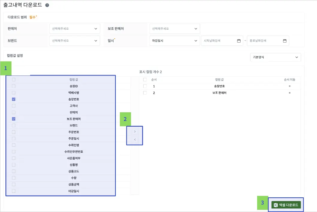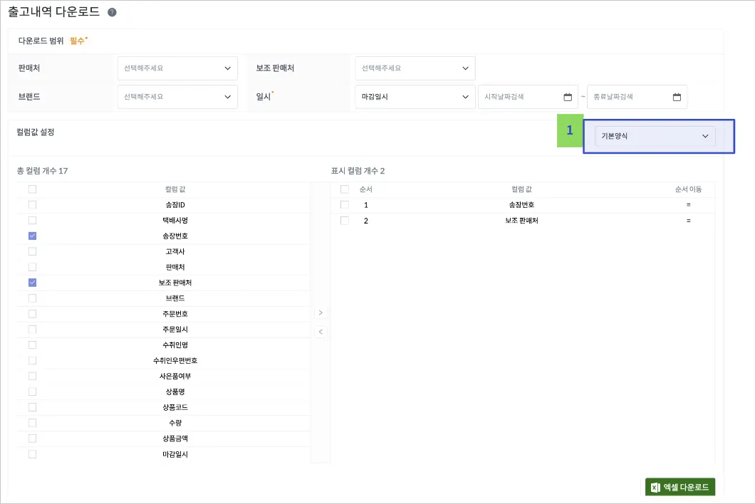 컬럼 값 - 매칭할 열 값은 기본적으로 고정되어 있고, 비고(내역)에 해당하는 값은 주문번호 또는 송장번호 두 가지 중 선택 가능