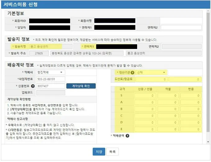 계약한 센터에 따라 입력할 배송 계약 정보가 달라집니다.
