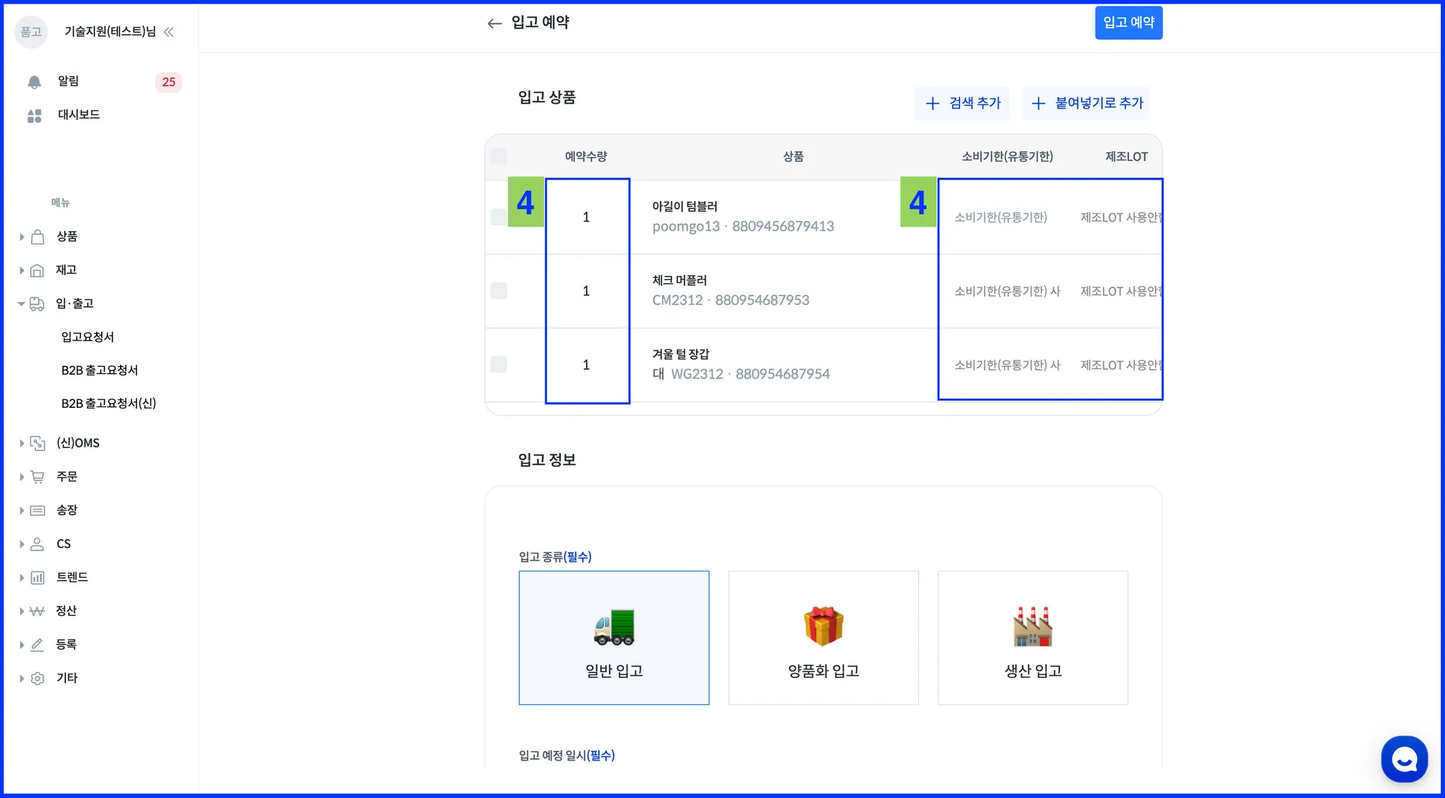 입고할 수량 및 상품의 유통기한,제조LOT 사용 여부에 따라 기입합니다.