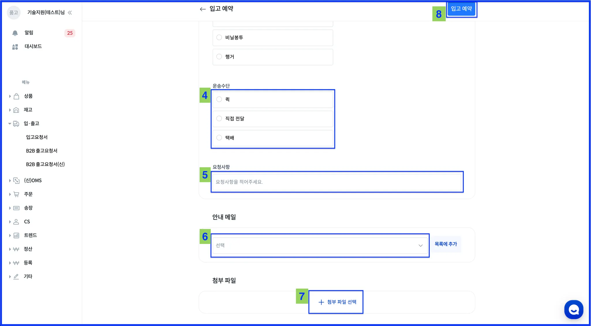 입고시 요청사항 기입