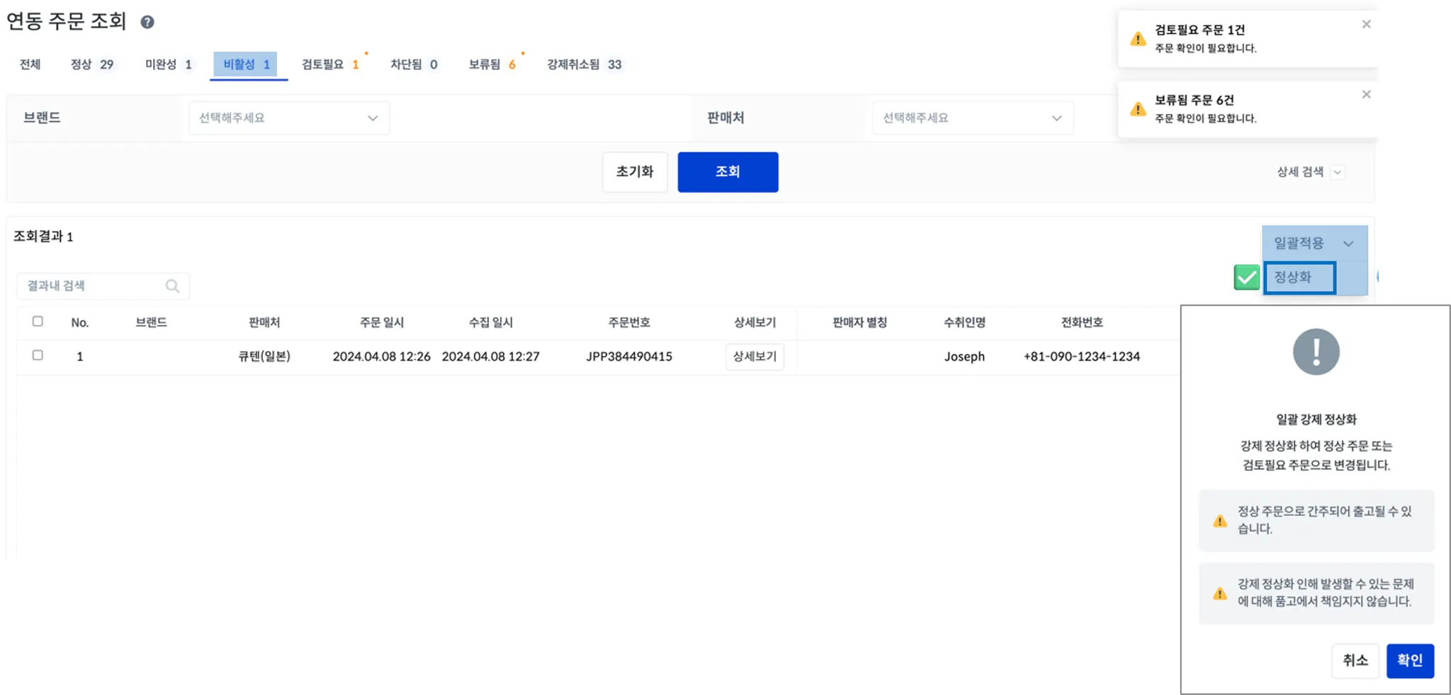 정상화 : 필터된 주문을 정상 상태로 변경 처리 가능 / 정상 탭에서 확인 가능