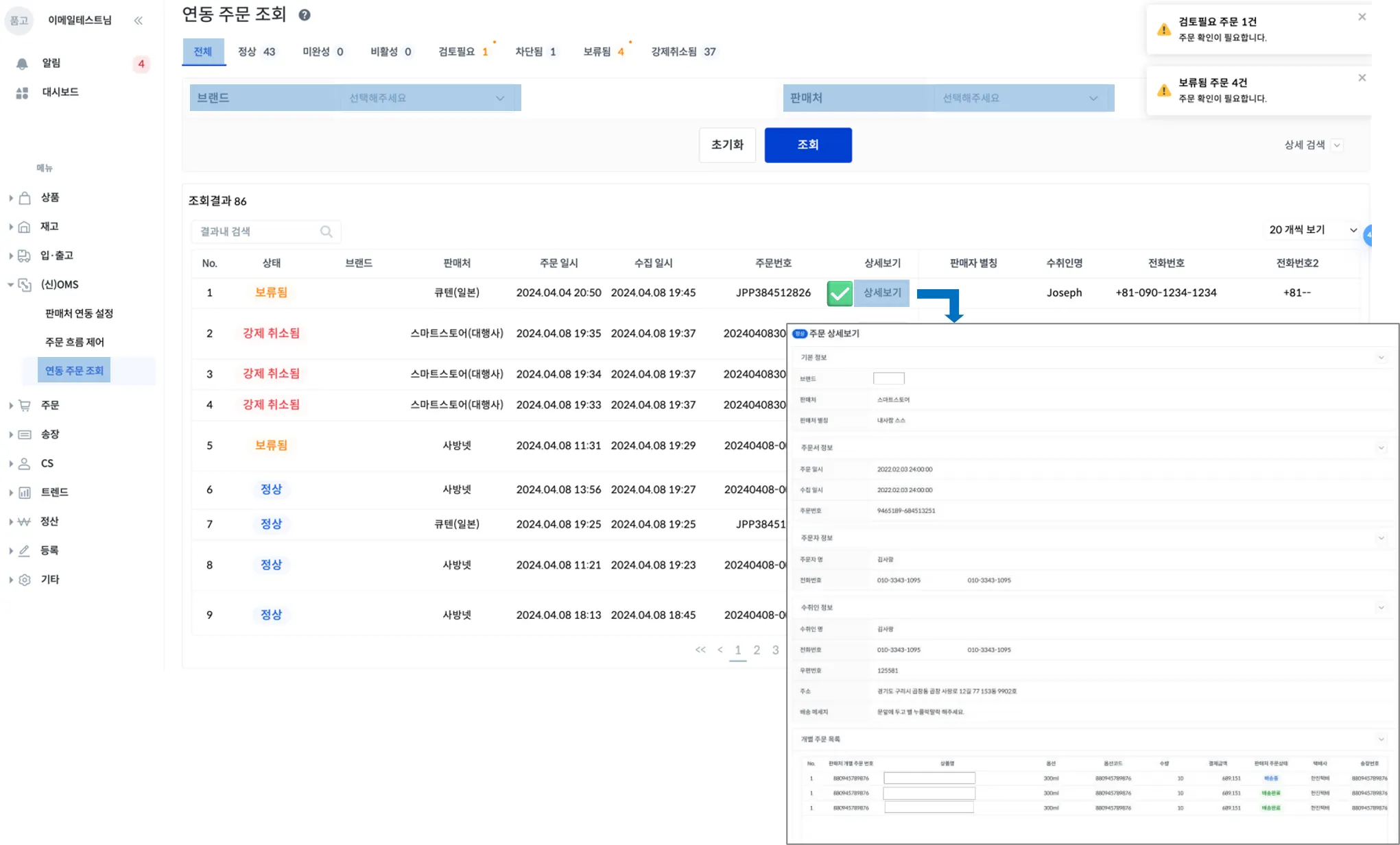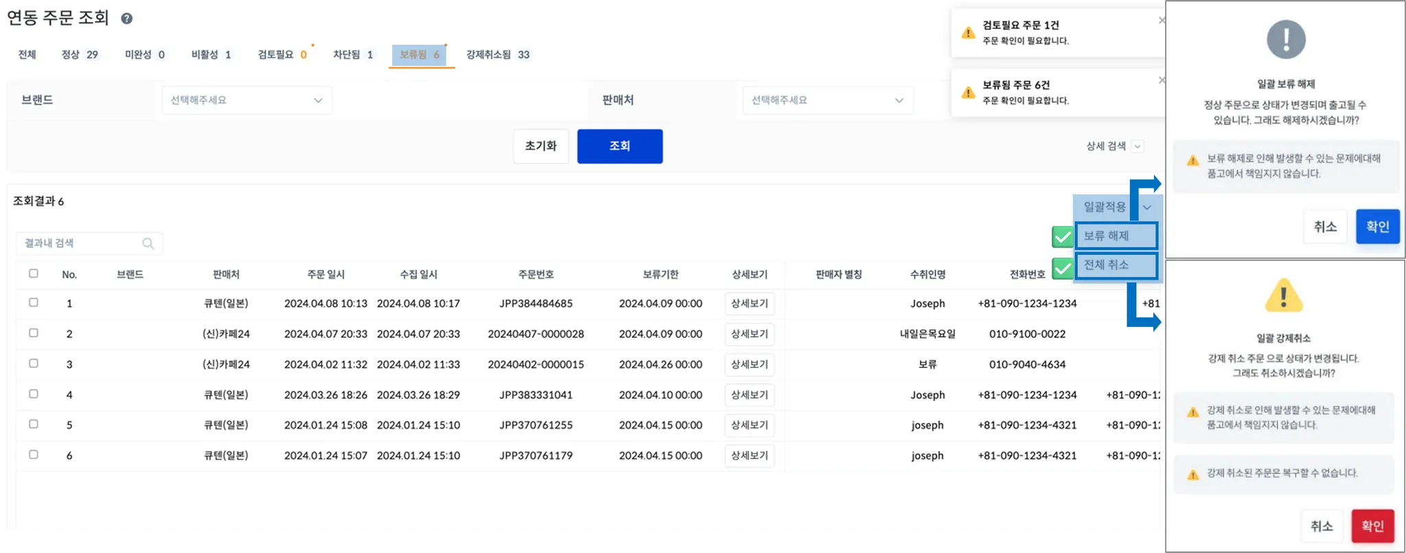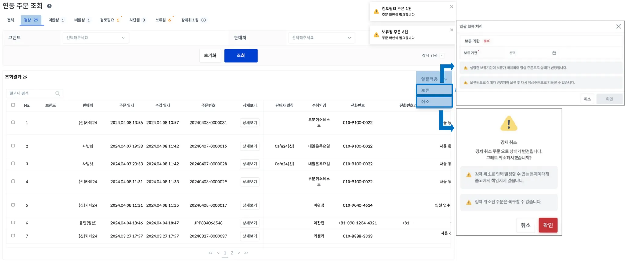 보류 해제 : 보류된 주문을 정상 주문 상태로 변경 가능 / 정상 탭에서 확인 가능