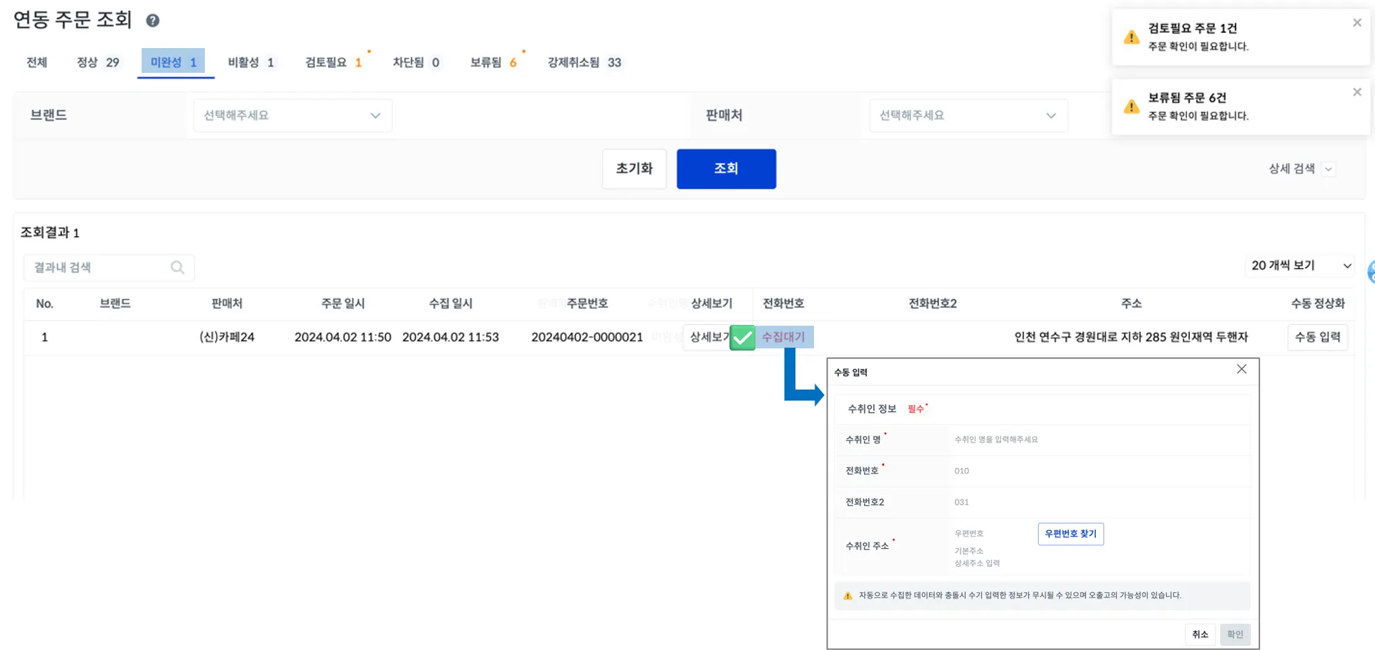 미완성 : 연동된 주문 중 주문 정보가 부족한 상태의 주문 확인 ex. 카카오톡 선물하기, 네이버 선물하기 등…