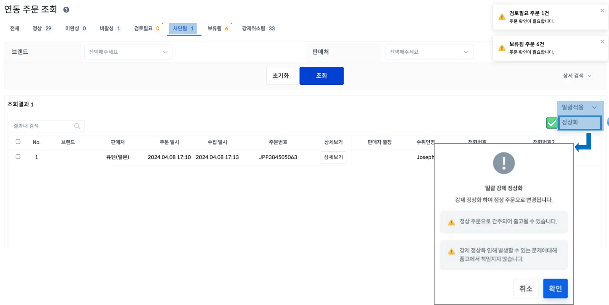 정상화 : 차단 주문을 정상 주문 상태로 변경 가능 / 정상 탭에서 확인 가능