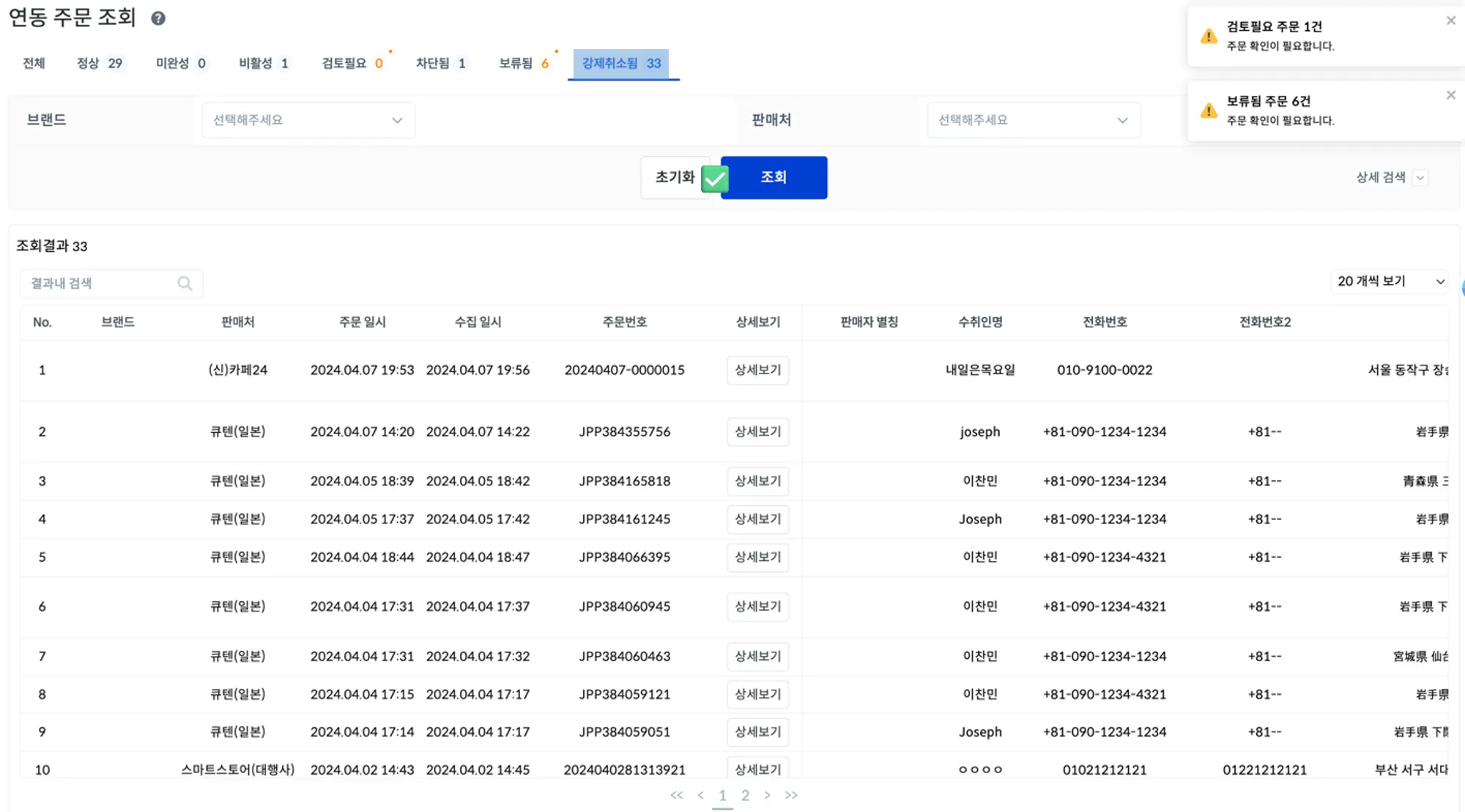 강제취소 : 연동된 주문 중 강제취소된 주문 확인