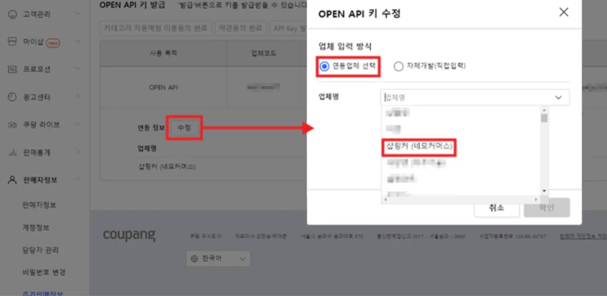 연동정보 → 수정 버튼 → 연동업체 선택 → 샵링커(네모커머스) 선택 →확인