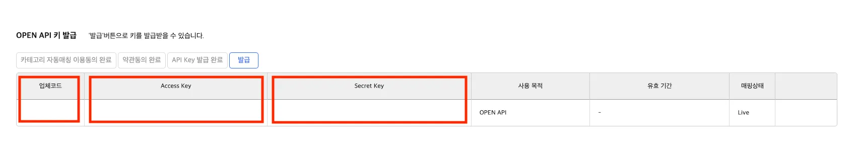 업체코드 / Access Key / Secret Key 복사 후, 전달