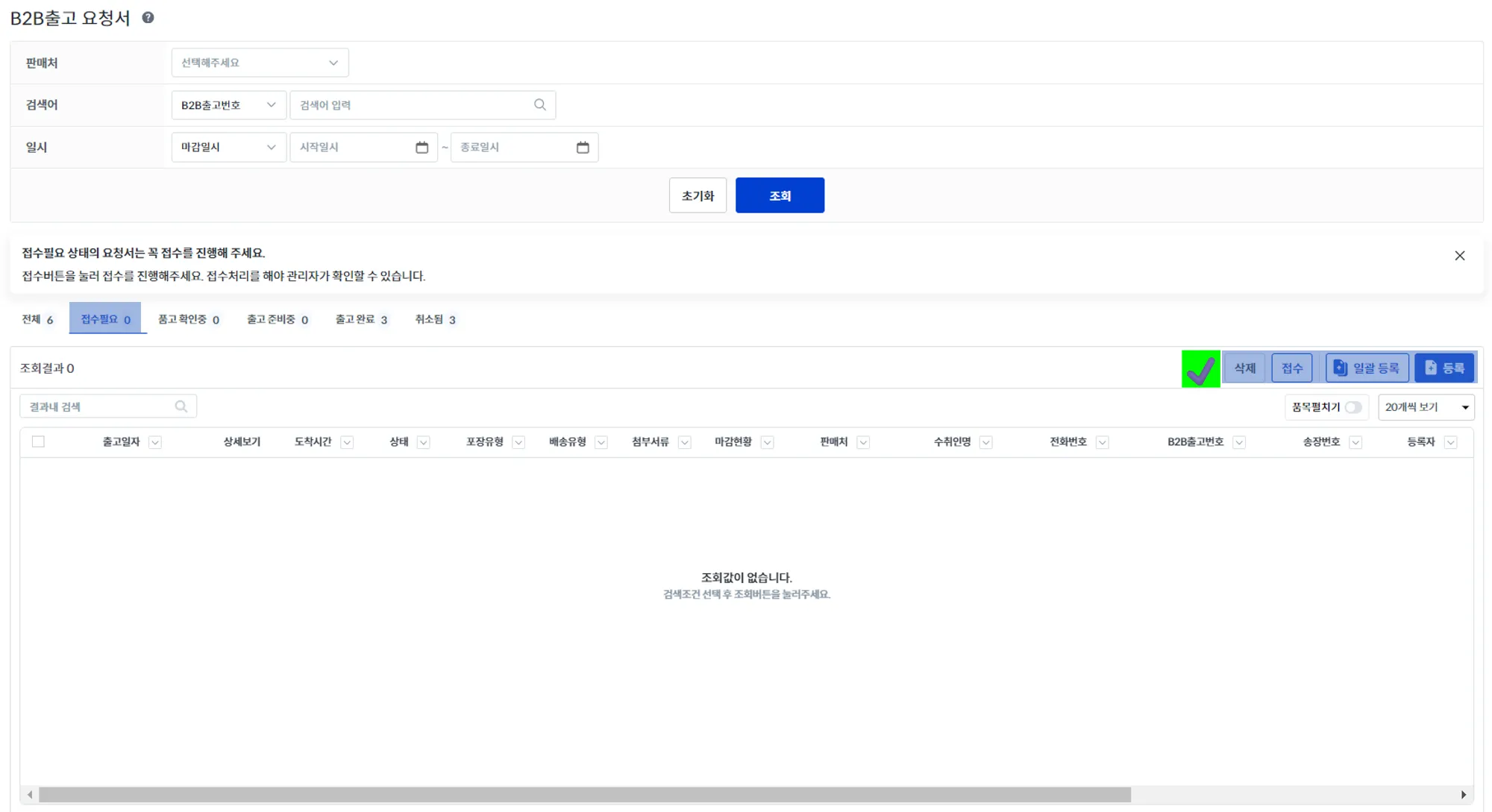 접수필요 : B2B 출고 내용을 등록한 상태로 접수를 하기 전 단계