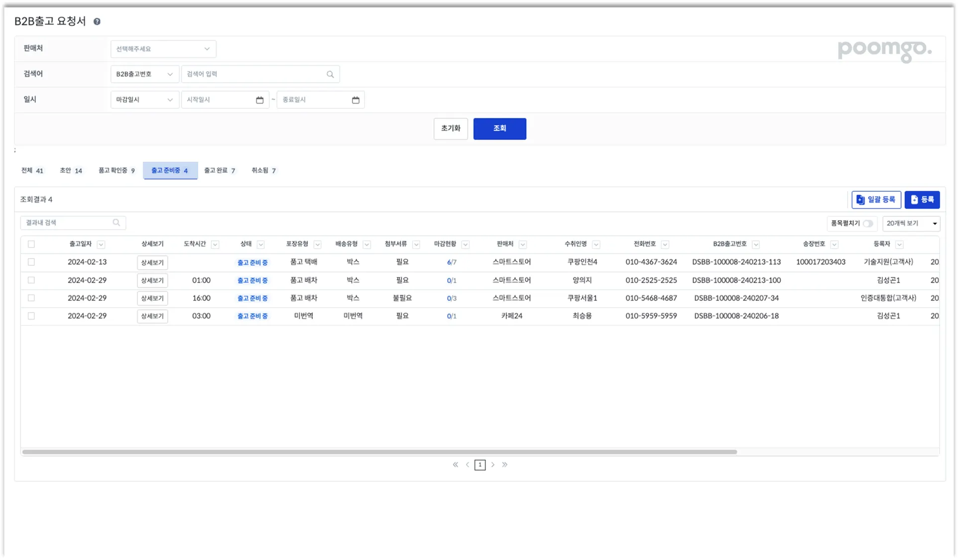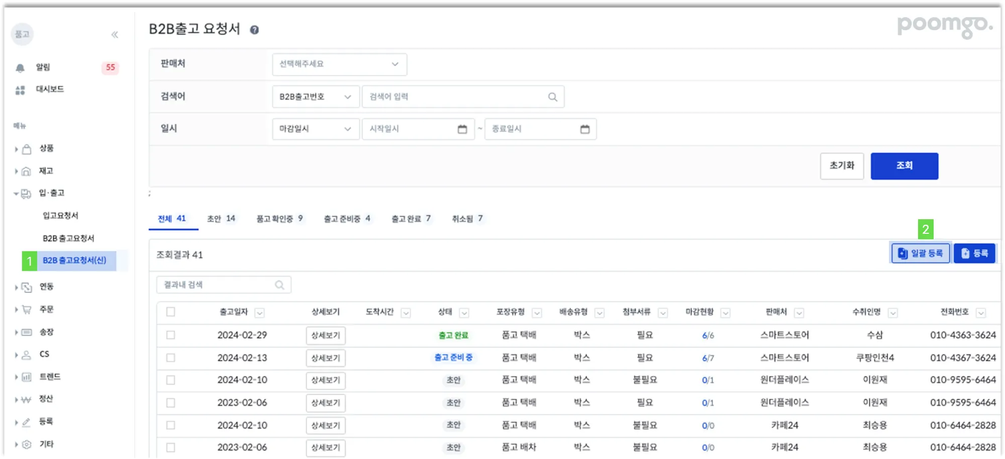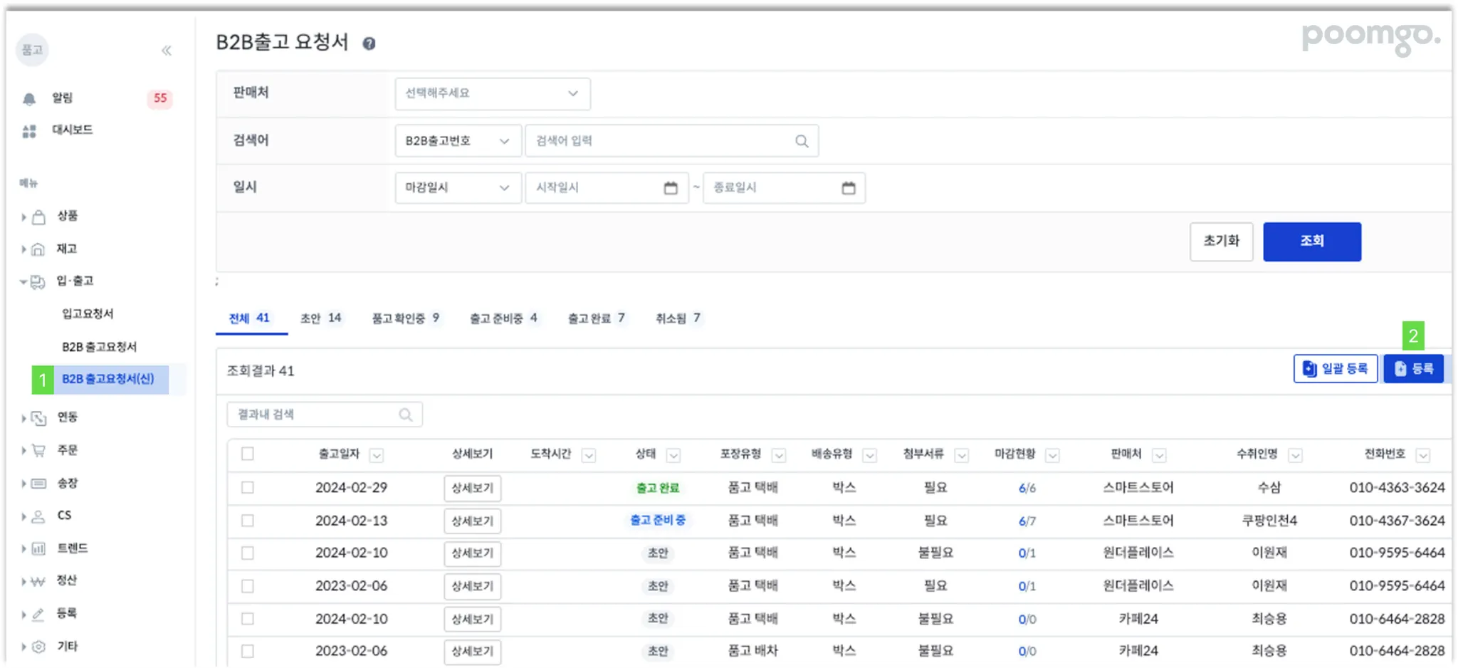[1] 품고 나우 > 입.출고 > B2B 출고요청서(신)을 클릭해 주세요.
