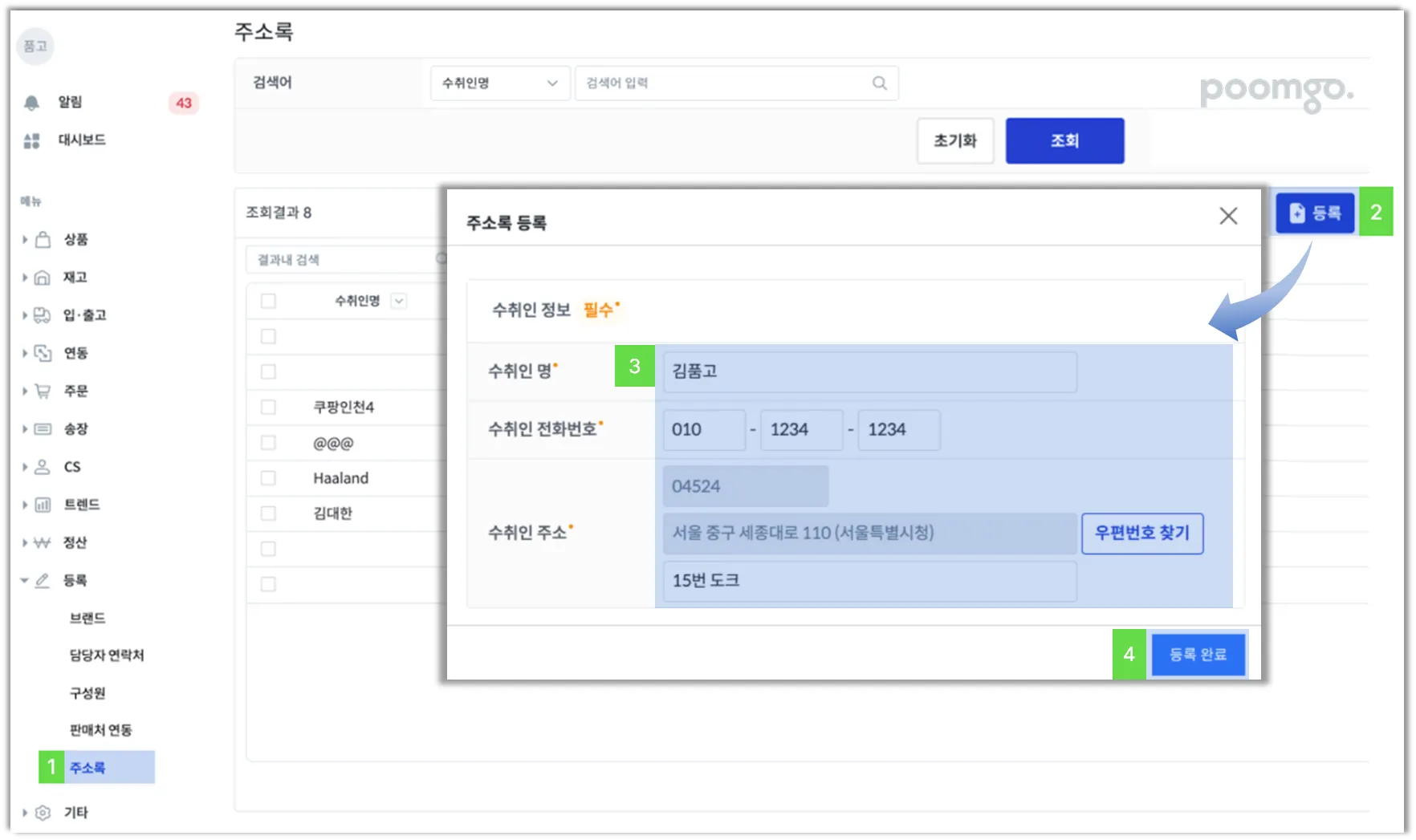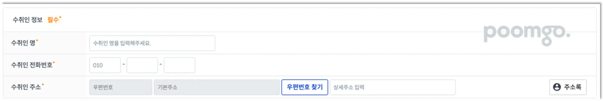 수취인 정보 수취인 정보를 직접 입력하시거나, 주소록을 활용하여 수취인을 선택해 주세요.