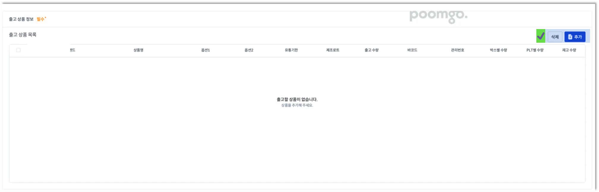 오른쪽 추가 버튼을 클릭 후 출고가 필요한 품목을 선택 후 추가해 주세요.