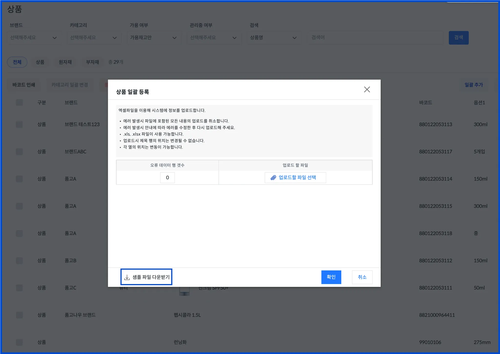 <품목 - 검색/추가 - 품목 일괄 등록 >