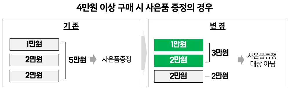 기존 주문번호 → 배송비묶음번호 로 기준 변경되면서 금액대별 사은품에 대한 기준도 변경되며 이슈발생