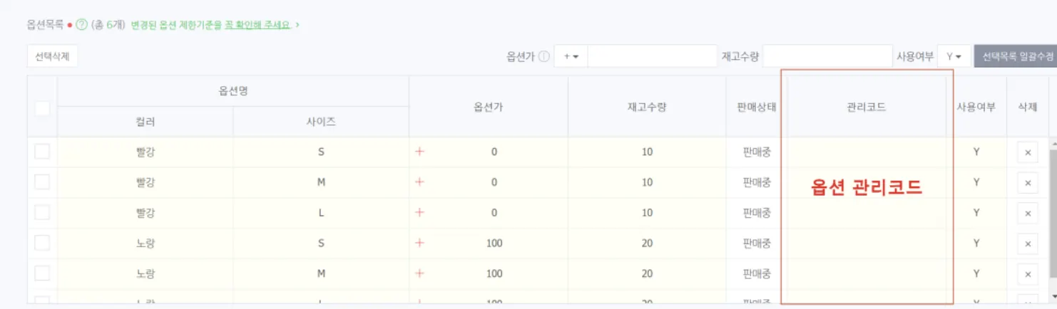 생성된 옵션관리코드가 물류사 시스템에 미입력 되는 경우, 품절이 발생 될 수 있습니다.