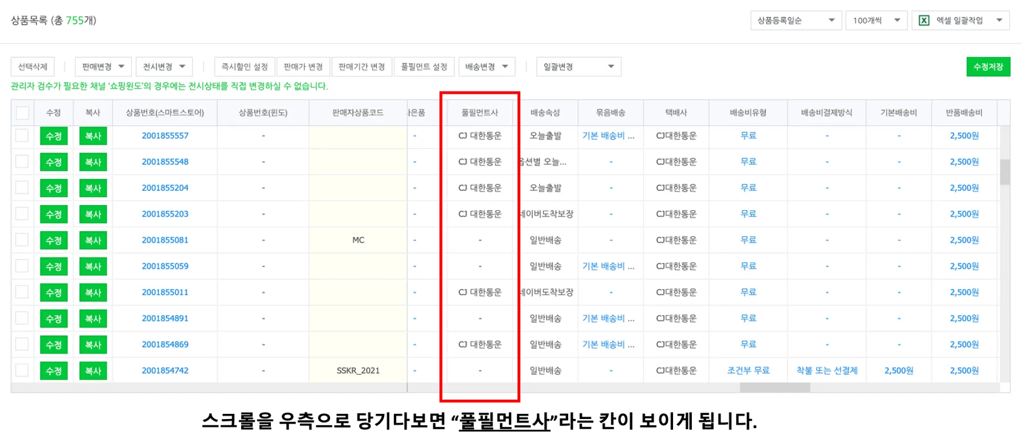 ※ 판매자센터 상품 조회 화면에서 “풀필먼트사”칸에 물류사명 기재되어 있으면 풀필먼트 연동,