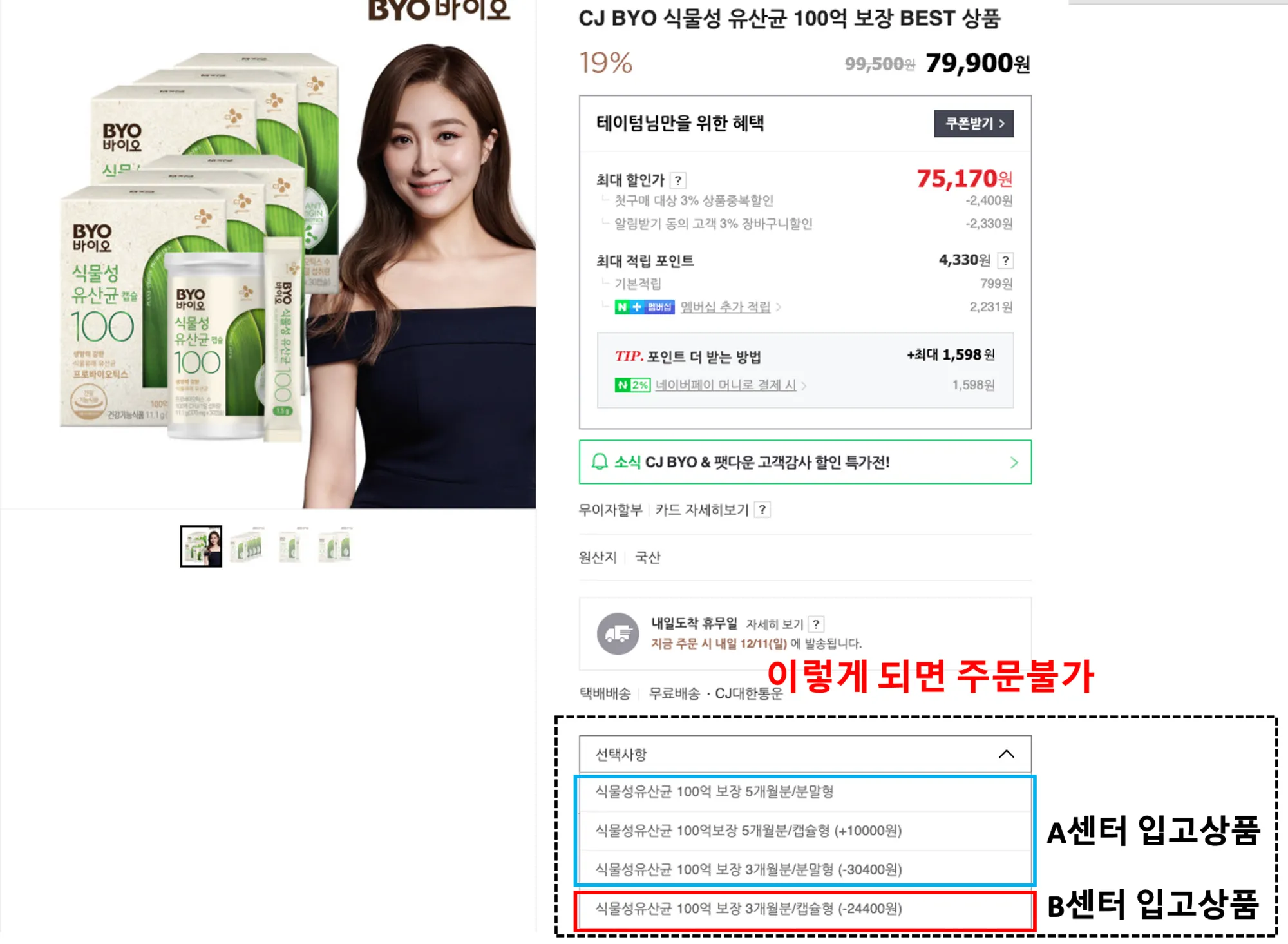 서로 다른 물류센터에 입고된 상품을 같이 옵션 설정할 수 없습니다.
