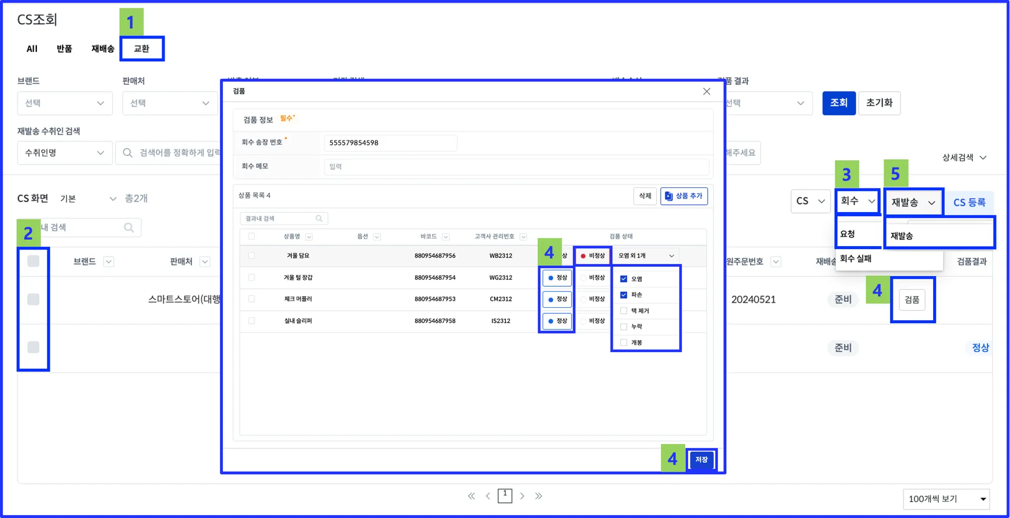 상품별로 검품 상태(정상과 비정상)를 선택한 후 하단의 저장 버튼 클릭
