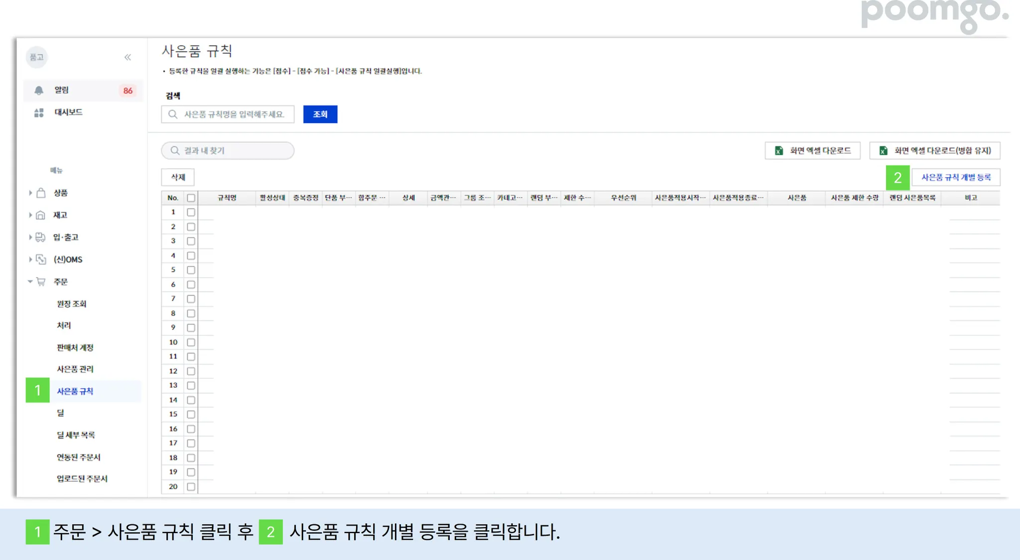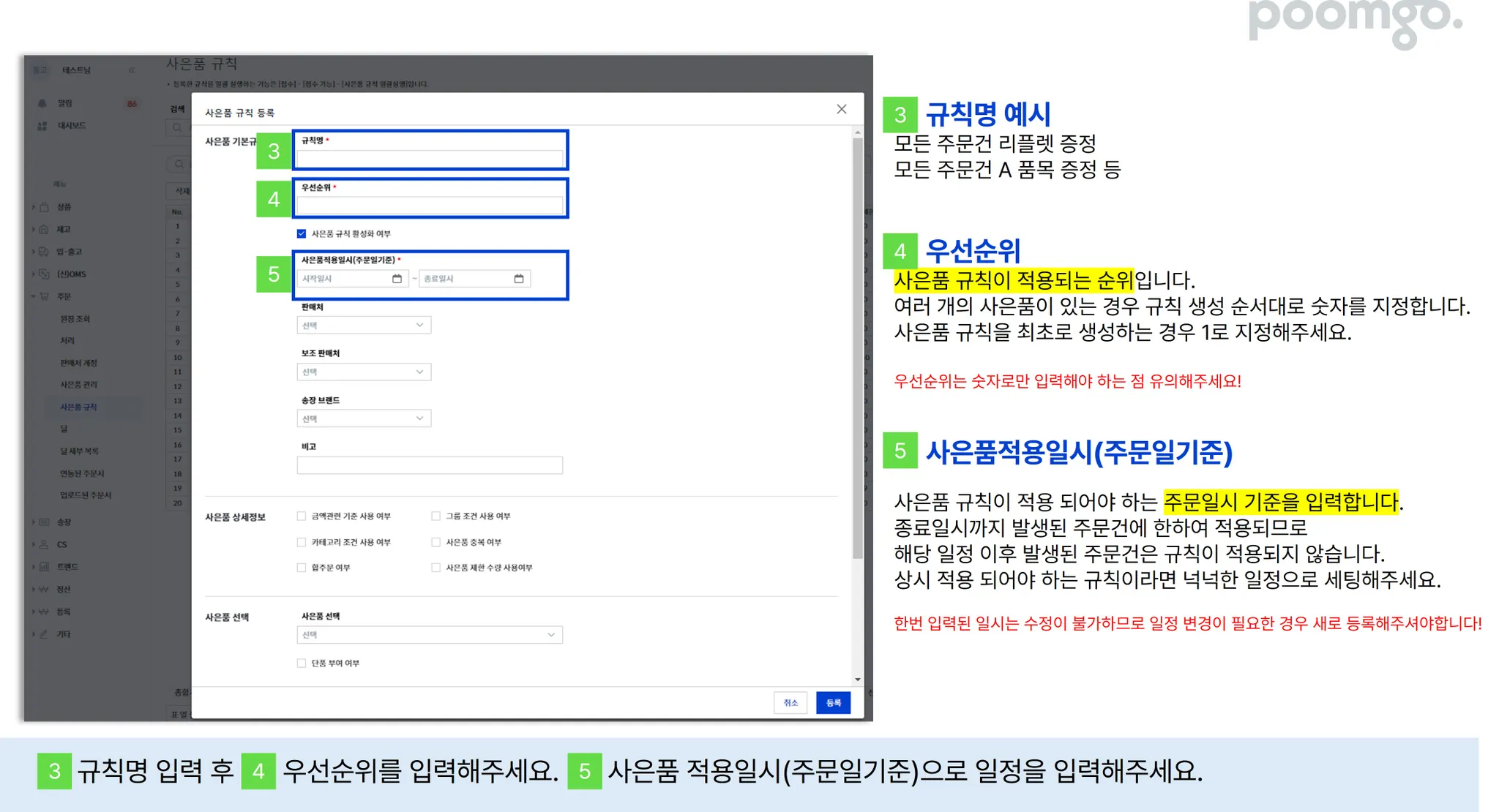 특정 딜에 사은품 증정 규칙 생성 방법은 아래 이미지와 순서를 확인해주세요 이미지는 더블 클릭 시 확대됩니다.