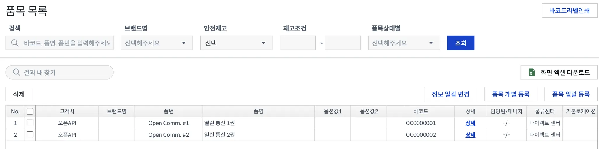 품고나우 UI를 통해 등록된 품목 목록을 조회합니다.