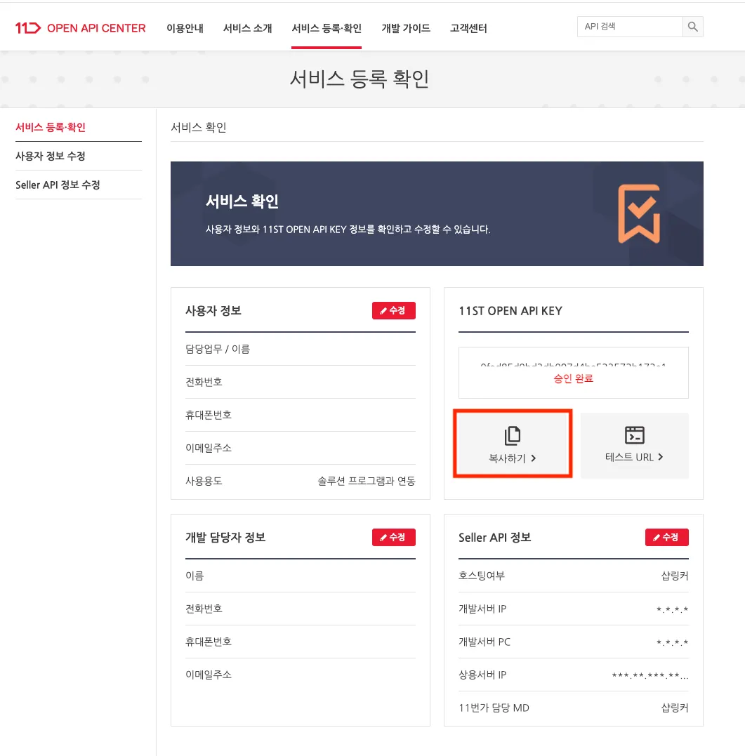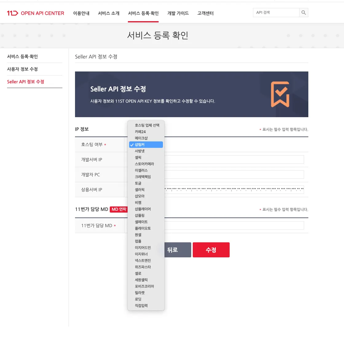 우측 하단에 Seller API 정보에서 수정 버튼 클릭