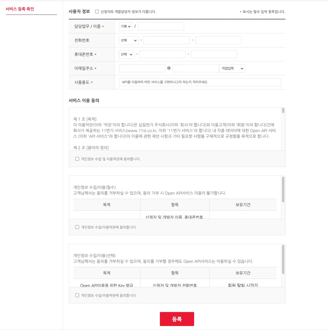 사용자 정보와 서비스 이용 동의 설정하고 등록 버튼 클릭